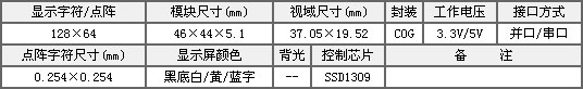 描述:顯示點陣:128X64,品牌:金鵬 ,模塊尺寸:46X44X5.1,視域尺寸:37.05X19.52 控制IC:SSD1309 封裝COG 串口/并口,工作電壓3.3V(2.7-3.5),工作溫度-40至70