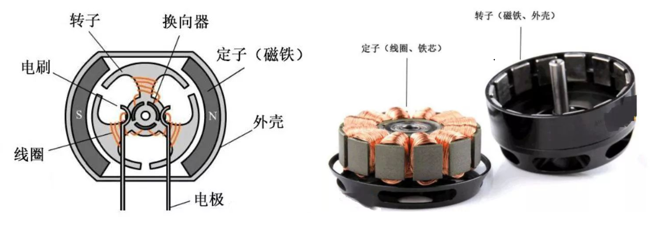 圖 1-2 左側(cè)為有刷電機(jī)、右側(cè)為無(wú)刷電機(jī)(圖片來(lái)自網(wǎng)絡(luò))