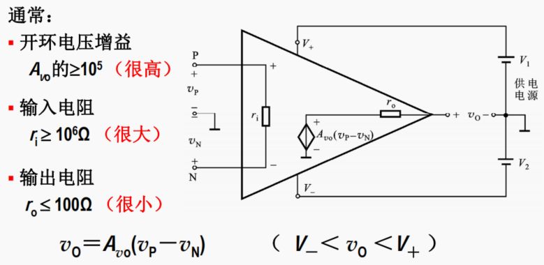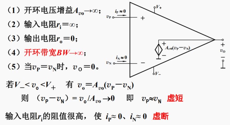 ● 理想的運(yùn)算放大器具有無(wú)窮大的開(kāi)環(huán)增益,無(wú)窮大的輸入電阻和 0 輸出電阻,即:Avo→∞,ri→∞, ro=0。
