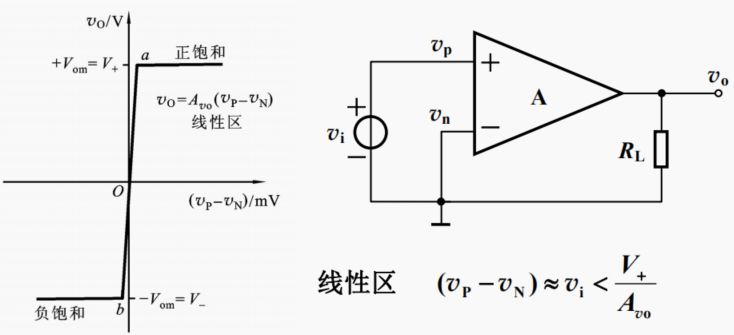 ● 運(yùn)算放大器有兩個(gè)工作區(qū),線性區(qū)和非線性區(qū)。 在線性區(qū),其放大同相輸入端與反相輸入端之間的差值信號(hào)(vP-vN)。 運(yùn)算放大器開(kāi)環(huán)(無(wú)負(fù)反饋)工作時(shí),很容易進(jìn)入非線性區(qū),輸出電壓接近電源電壓。