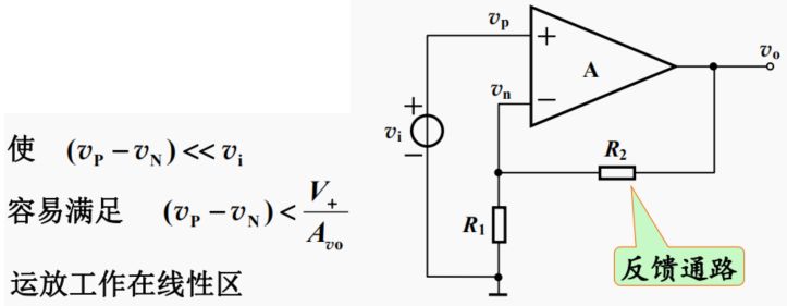 ● 通過(guò)引入合理的負(fù)反饋而使運(yùn)算放大器穩(wěn)定工作于線性放大區(qū),此時(shí)可以通過(guò)“虛短”和“虛斷”來(lái)分析運(yùn)放構(gòu)成的線性電路。